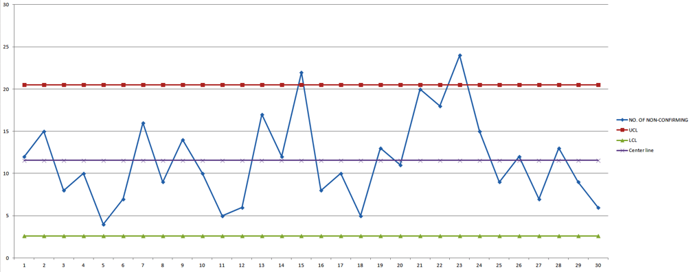 Let us consider a sample of 50 numbers taken from a batch during processing & during inspection 10 numbers from sample found non-confirming. Then fraction of non-confirming (P) is 0.2 or in percentage 20%.