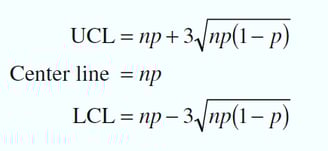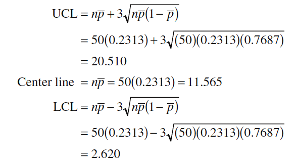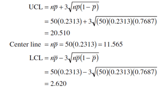 Since the n=50 samples contain nonconforming products, Using as an estimate of the true process number of nonconforming, we can now calculate the upper and lower control limits as given below: